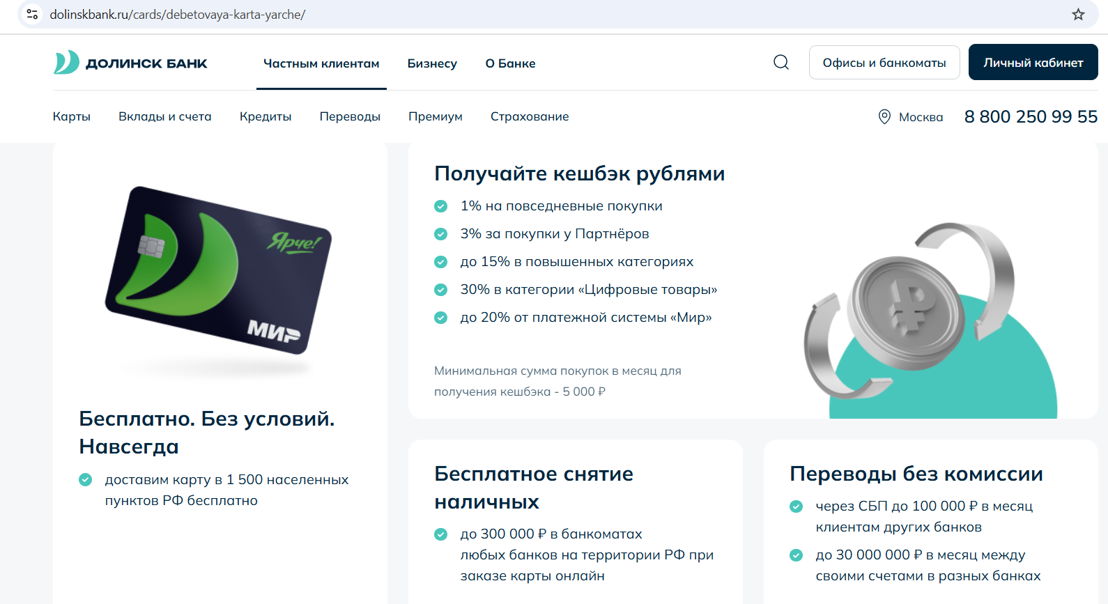 Выпуск и обслуживание дебетовой карты «Ярче!» от банка «Долинск» бесплатны без условий, заявку на карту можно оставить онлайн (выдают лицам с 22 лет):