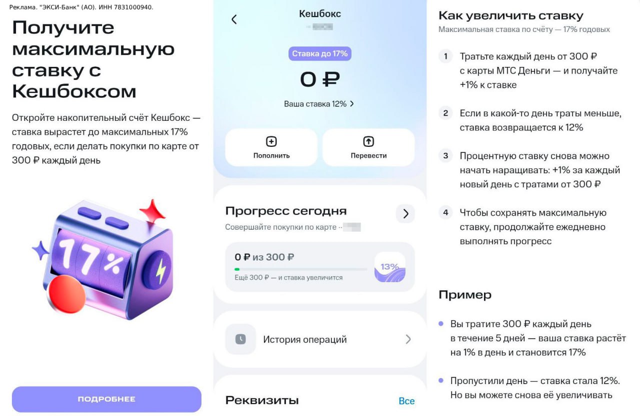 • ставка растет на 1 п.п. за каждый день с тратами от 300 руб. по карте «МТС Деньги»;