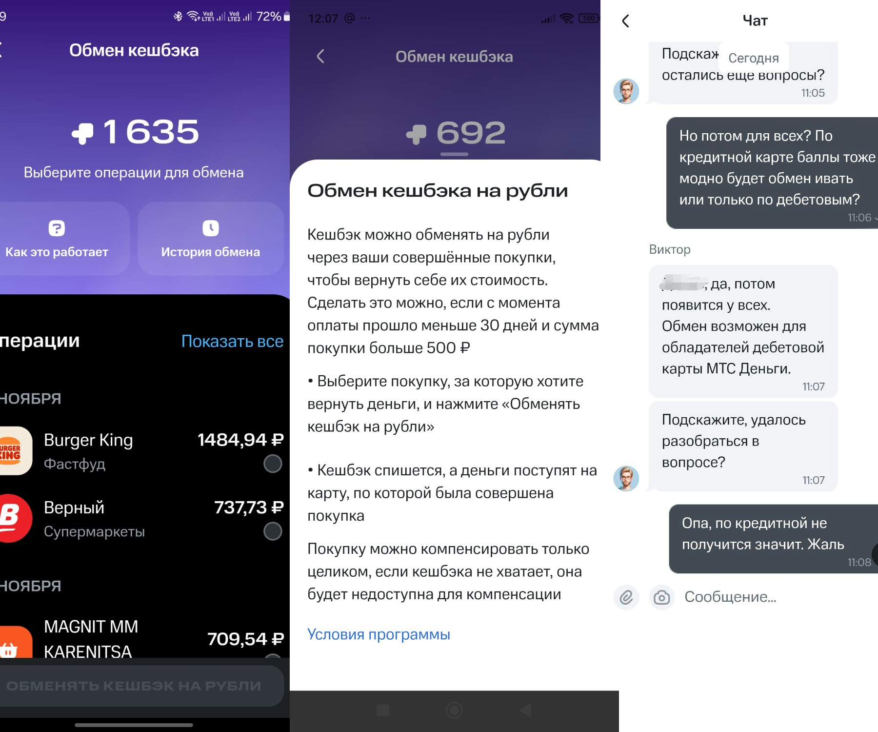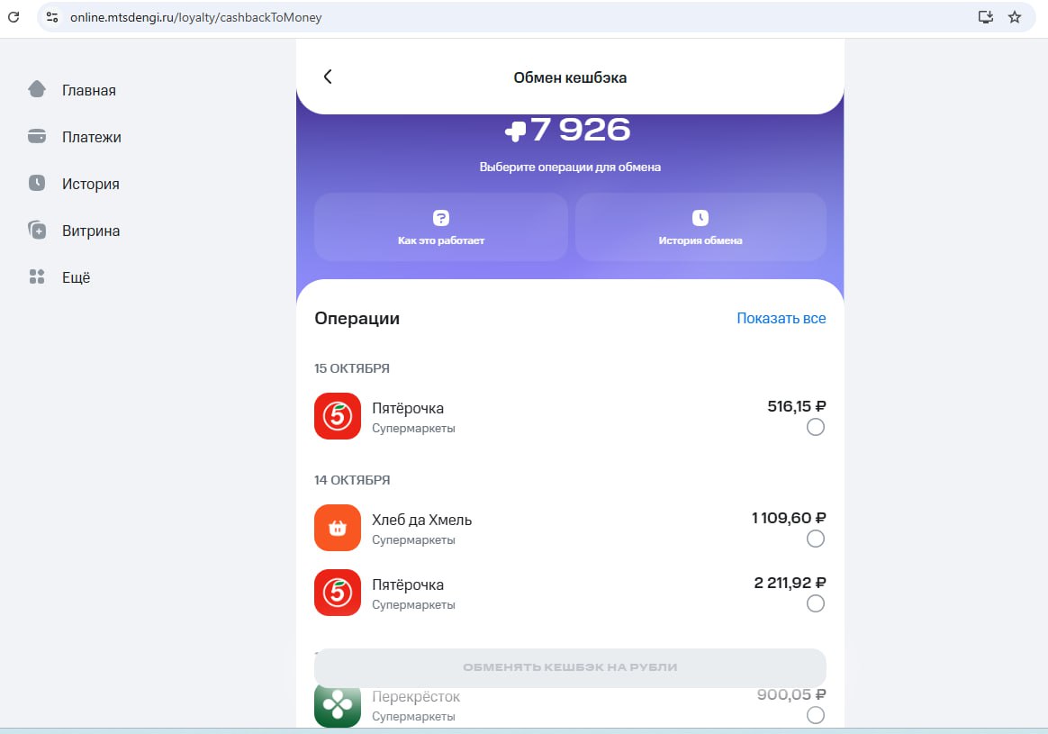 «ЭКСИ-Банк» некоторым клиентам по карте «МТС Деньги» предлагает обменивать баллы кэшбэка напрямую в рубли. Должен появиться соответствующий баннер в приложении.