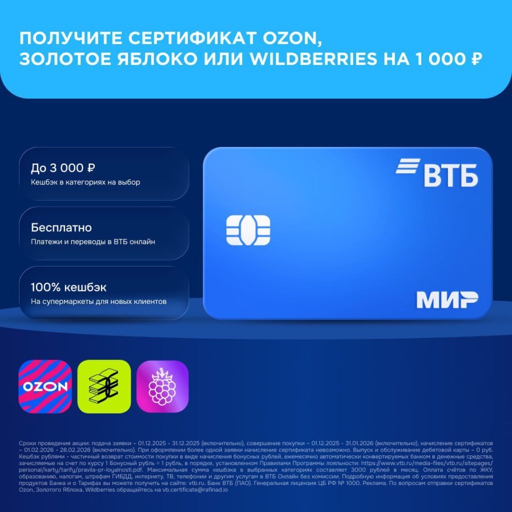 Если у вас минимум с 02.09.25 не было заявок на дебетовую карту «ВТБ», то при оформлении дебетовой карты «ВТБ» по ссылке в нашем телеграм-канале можно получить подарочный сертификат в OZON/WB/Золотое Яблоко на сумму 1000 руб. (нужно получить пластиковую карту и сделать по ней покупку от 500 руб.). При этом, если у вас уже есть карта «ВТБ», вы всё равно можно участвовать в этой акции.