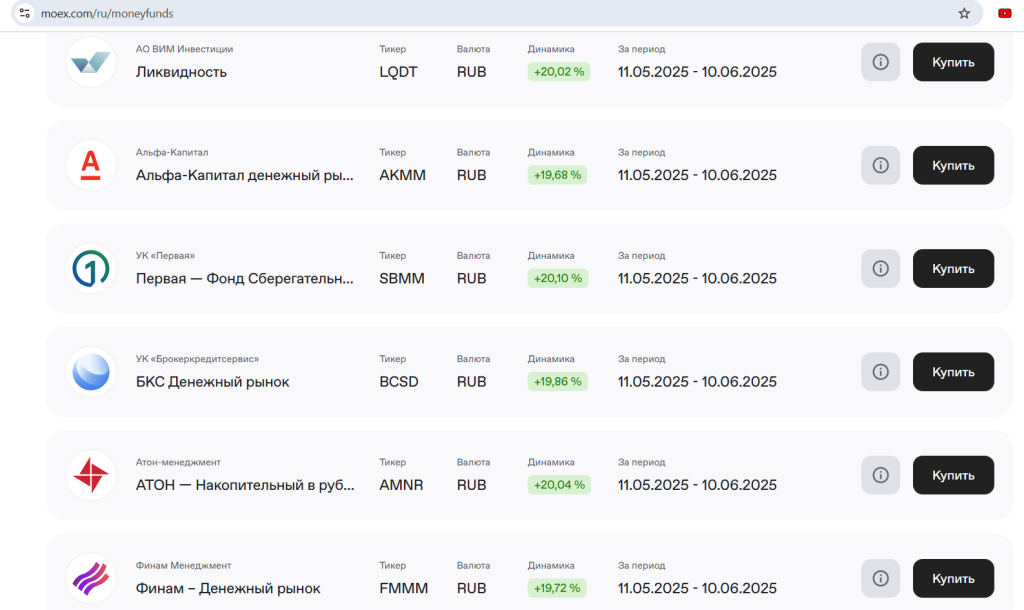 Доходность этих фондов зависит от ставки, под которую участники рынка готовы давать деньги друг друга в долг, т.е. это так называемая справедливая стоимость денег RUSFAR, которая коррелирует с ключевой ставкой, её актуальное значение можно посмотреть тут. На момент написания статьи 12.06.25 индекс биржевого денежного рынка составляет 19,92% годовых (ключевая ставка 20% годовых):