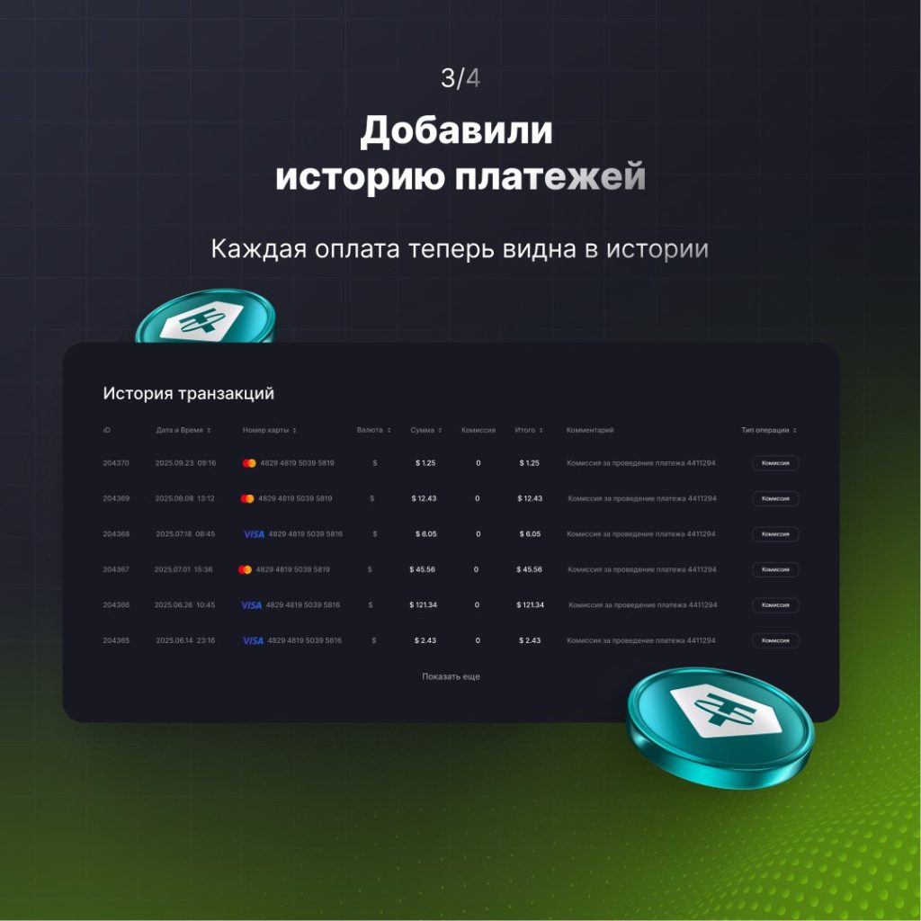 Карта неодноразовая, её можно пополнять на сумму от 10 USDT за раз. У карты в личном кабинете Alfabit есть история платежей.