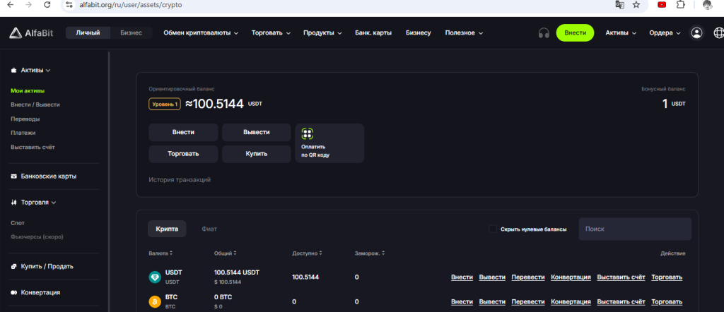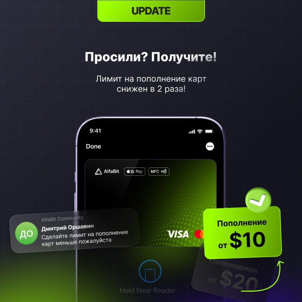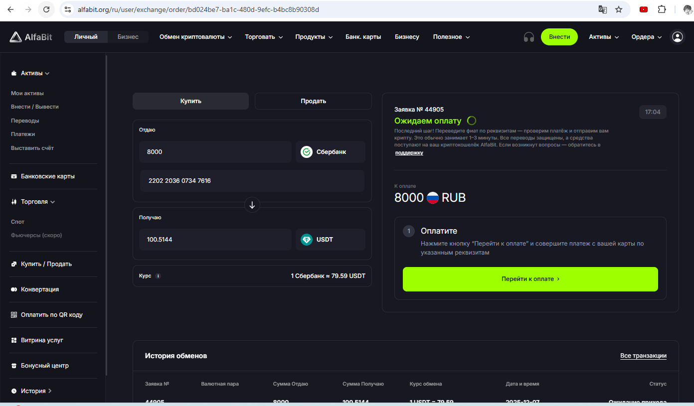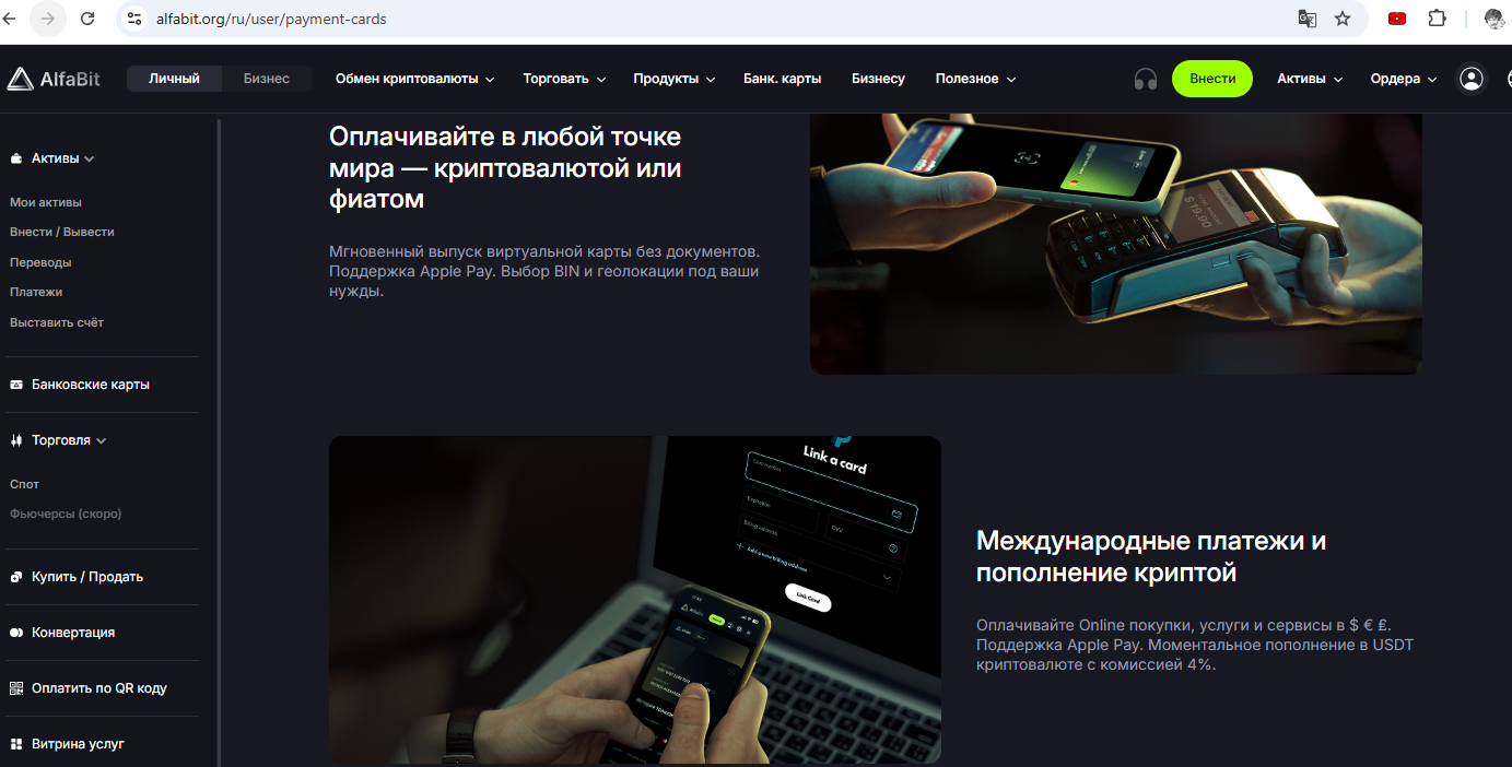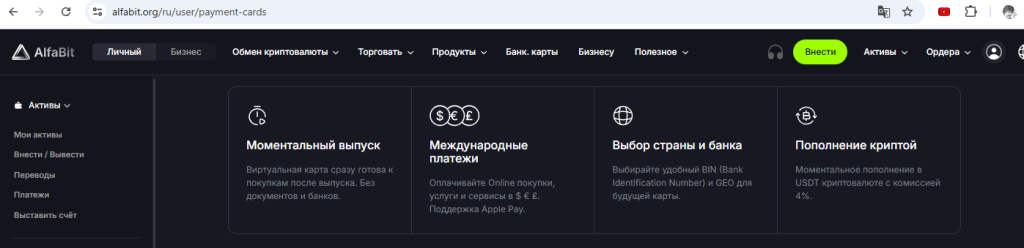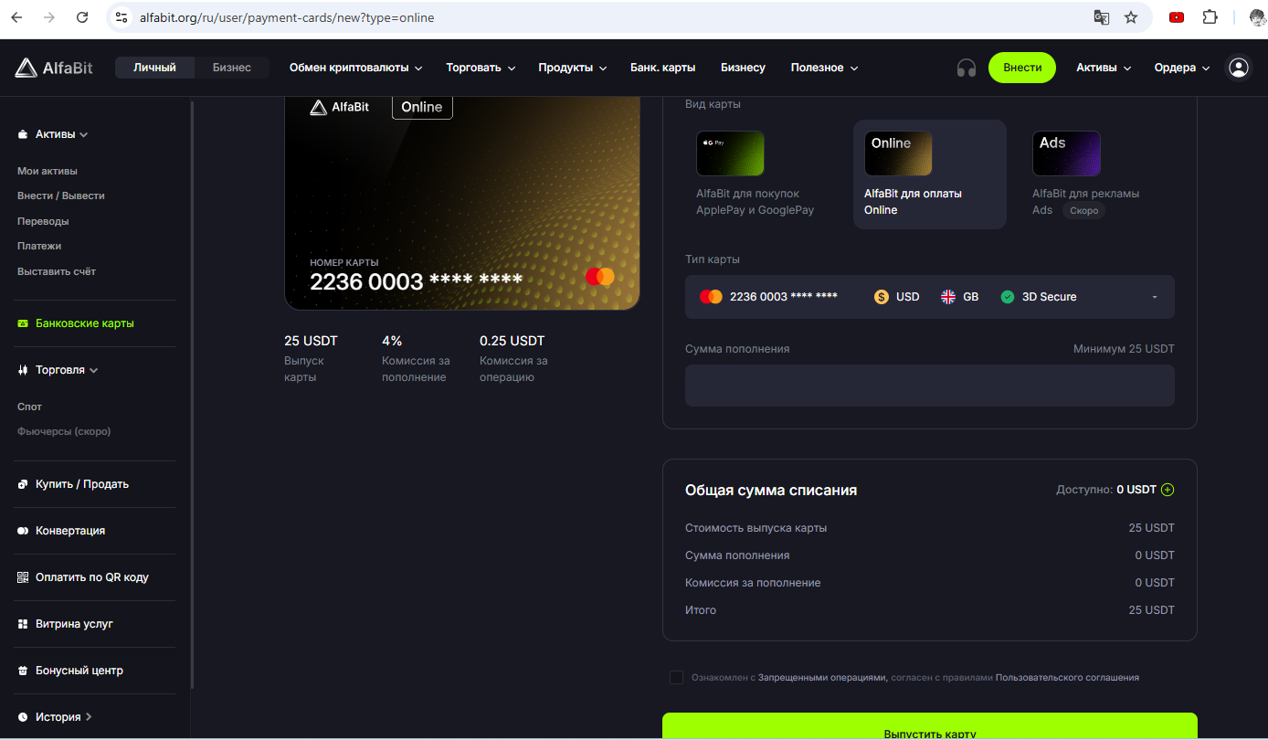 Ещё для граждан РФ есть быстрый вариант выпуска цифровой карты в USDT на бирже Alfabit (киргизская биржа) по этой ссылке. Верификацию для небольших сумм проходить не обязательно. Карта Visa/MasterCard для онлайн- или офлайн-оплат стоит 25 USDT, комиссия за пополнение 4%. Есть поддержка 3D-Secure. Комиссия за оплату составляет 0,25 USDT.