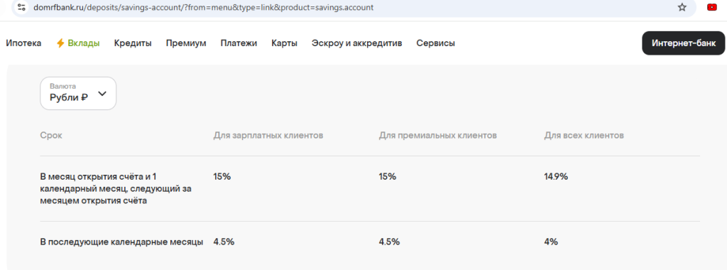 Процент на остаток по карте «Дом.РФ» не начисляется. В качестве альтернативы в банке можно открыть накопительный счёт с начислением процентов на ежедневный остаток, в месяц открытия и следующий за ним календарный месяц с 20.02.26 положено 14,9% годовых, для зарплатных и премиальных клиентов — 15% годовых: