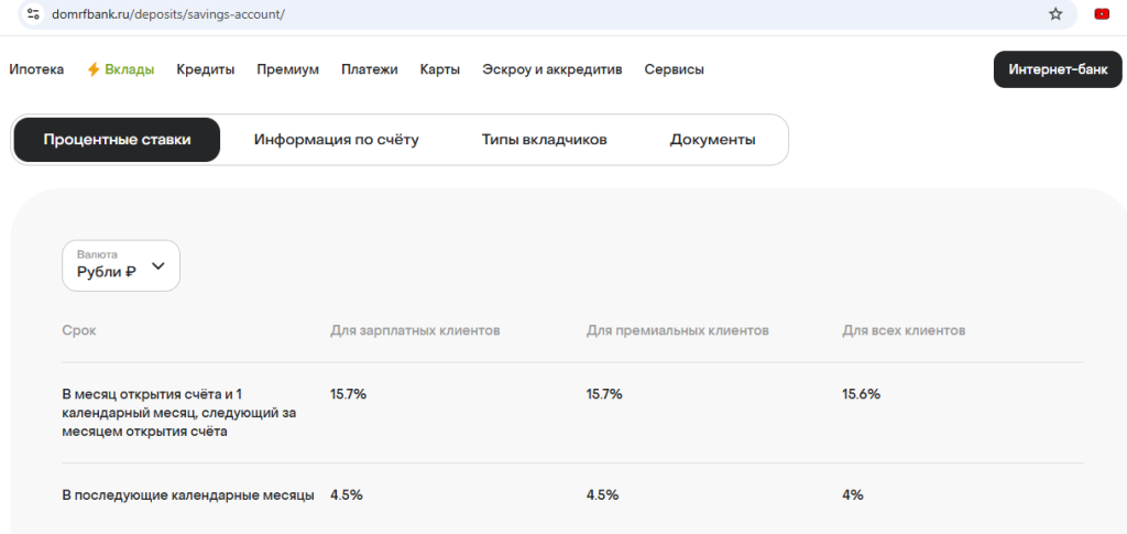 Процент на остаток по карте «Дом.РФ» не начисляется. В качестве альтернативы в банке можно открыть накопительный счёт с начислением процентов на ежедневный остаток, в месяц открытия и следующий за ним календарный месяц с 18.11.25 положено 15,6% годовых, для зарплатных и премиальных клиентов — 15,7% годовых: