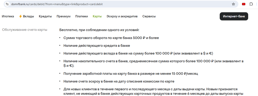 Обслуживание дебетовой карты банка дом РФ платежной системы МИР бесплатно при выполнении любого критерия (иначе 199 руб./мес.):