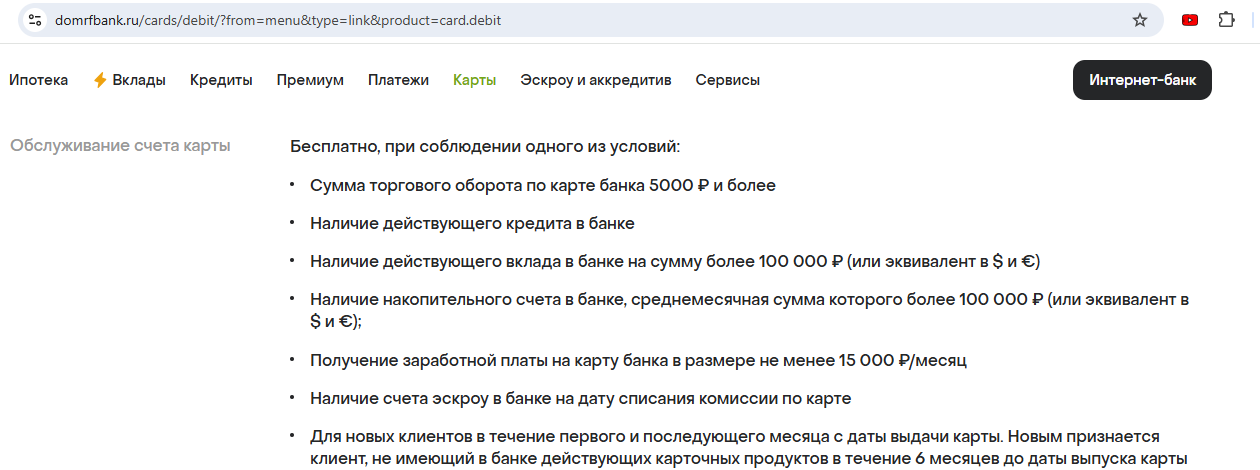 Хотелось бы, конечно, чтобы у карты было бесплатное обслуживание без каких-либо условий, всё-таки уже почти во всех крупных банках это реализовано.
