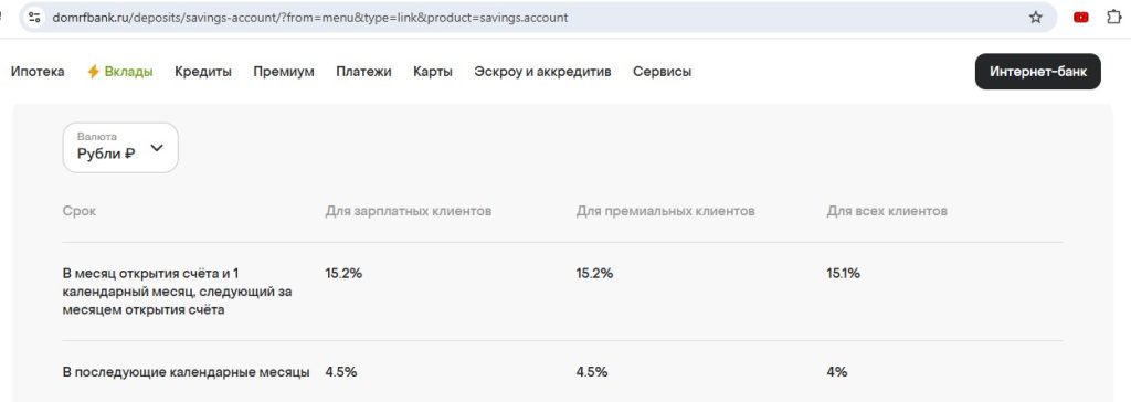 Процент на остаток по карте «Дом.РФ» не начисляется. В качестве альтернативы в банке можно открыть накопительный счёт с начислением процентов на ежедневный остаток, в месяц открытия и следующий за ним календарный месяц с 14.01.26 положено 15,1% годовых, для зарплатных и премиальных клиентов — 15,2% годовых: