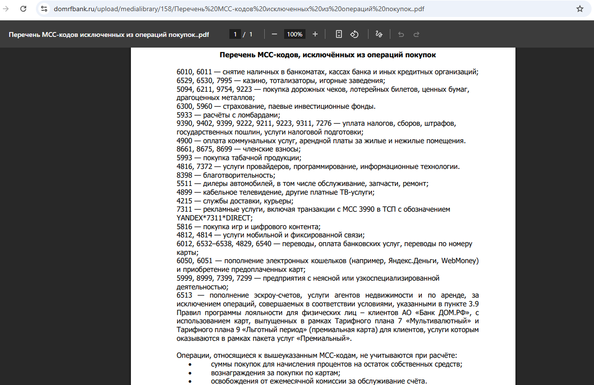 Список исключений для базового кэшбэка выглядит следующим образом (за покупки по СБП кэшбэка также нет):