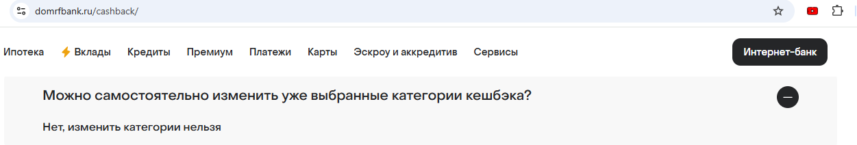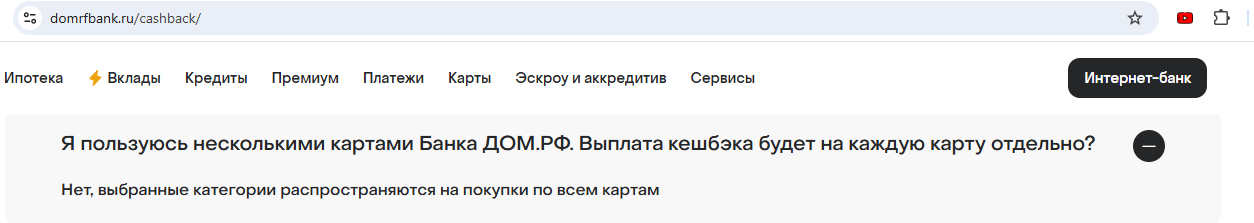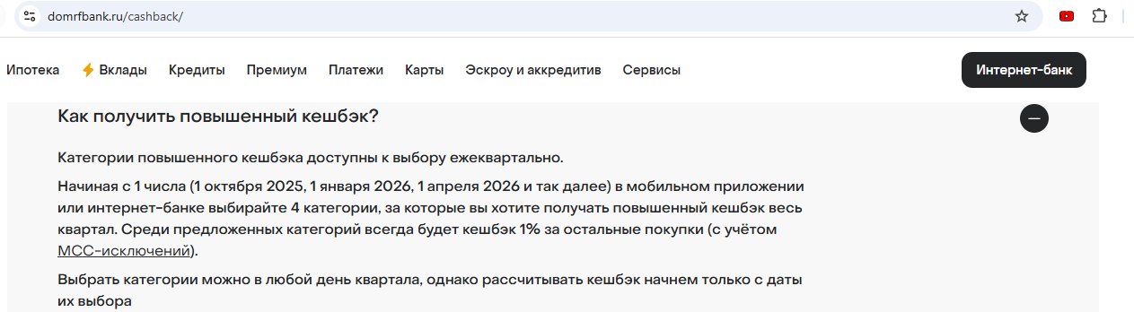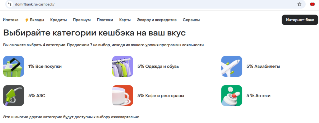 Карта банка «ДОМ.РФ», конечно, не претендует на роль универсальной, однако умеет довольно многое. Она будет очень кстати для тех, кто собирается делать ремонт или готовится к дачному сезону. UPD: в банке теперь на каждый квартал можно выбирать 4 любимых категории с кэшбэком 5% (либо 3 категории с 5% кэшбэка и 1% на все остальное).