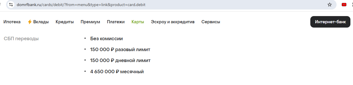 Другими словами, с карты банка «ДОМ.РФ» можно стягивать денежные средства через сторонние сервисы без комиссии при сумме операции от 3000 руб. (подобный лимит был раньше на картах «Тинькофф Блэк»). Естественно, делать это нужно через сервисы тех банков, которые позволяют стягивать бесплатно.