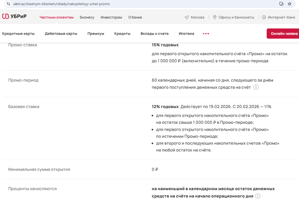 По накопительному счёту «Промо» от «УБРиРа» новичкам (раньше не было счёта «Промо») в первые два календарных месяца положено 15% годовых. Повторно новичком не стать.