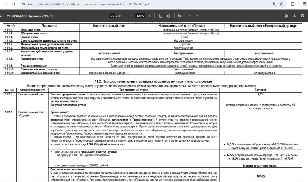 При желании, в «УБРиРе» можно открыть до 5 накопительных счетов (крупную сумму можно разбить на несколько счетов до 1 млн руб. и получать повышенные проценты).