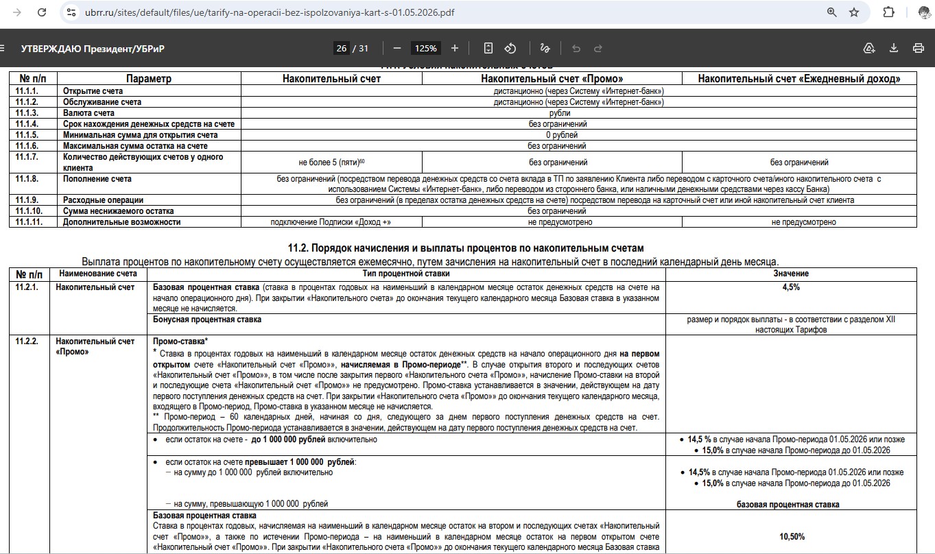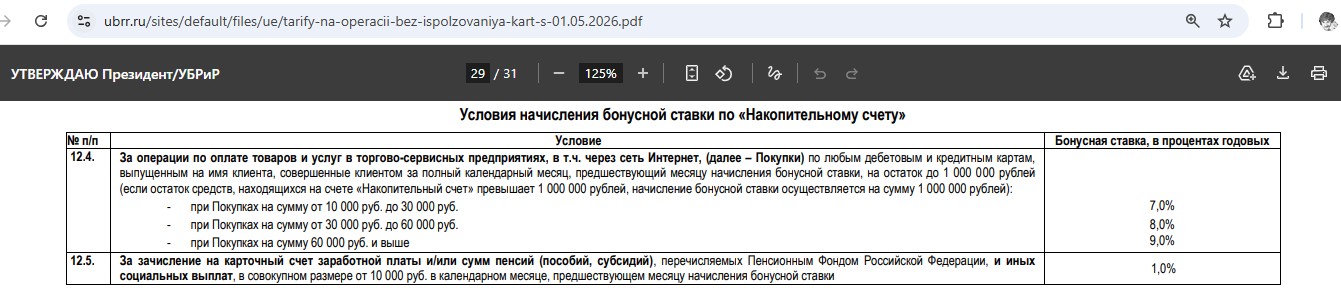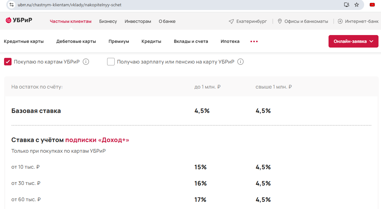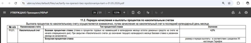 Базовая ставка на накопительном счете «УБРиРа» для любого остатка составляет 4,5% годовых на любой минимальный остаток за месяц (выплачиваются в конце месяца).