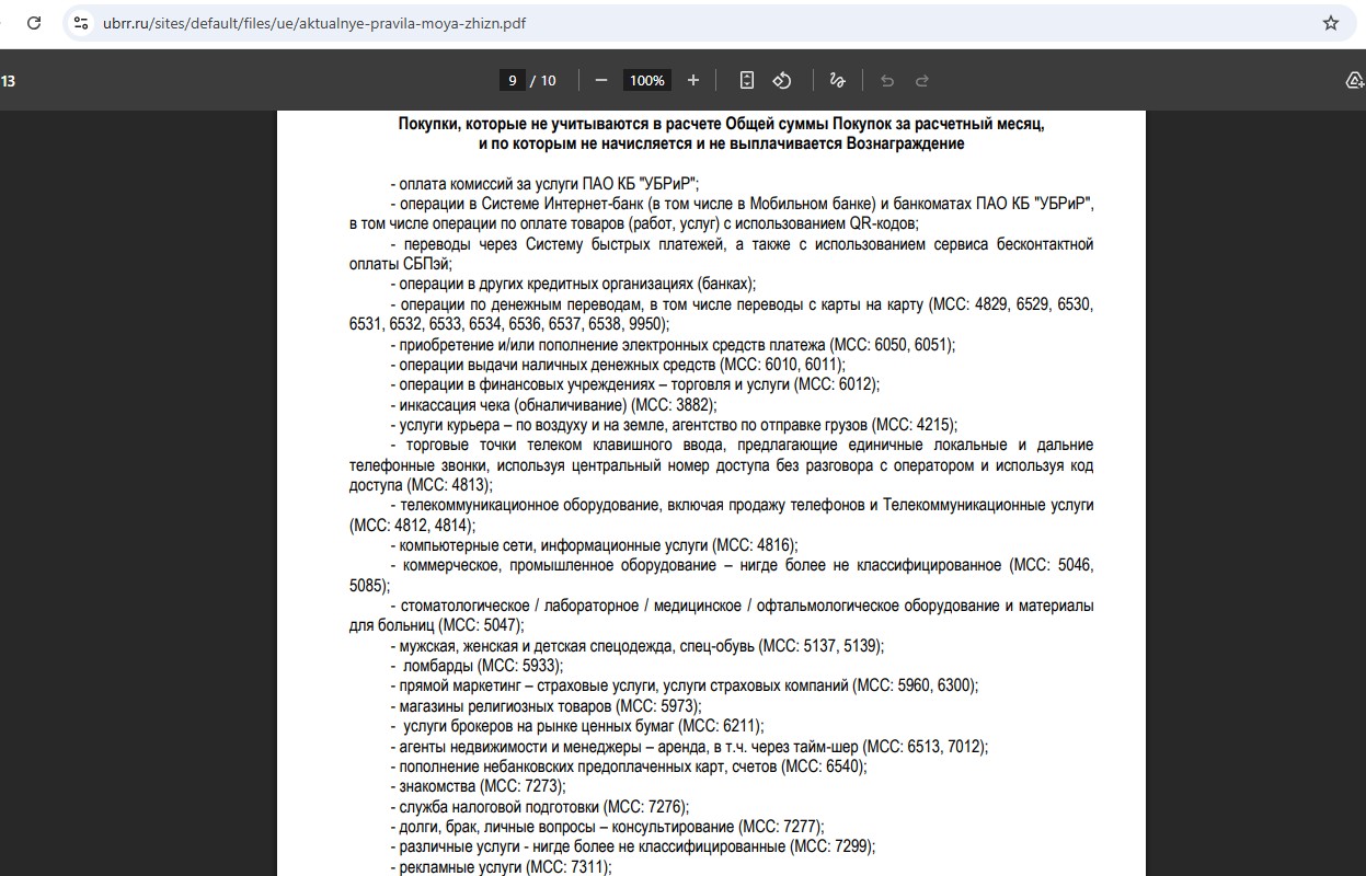Ниже представлен список операций, которые не учитываются в обороте и по которым не предусмотрен кэшбэк. Стоит обратить внимание, что за МСС 4900 кэшбэк будет, но в общем обороте трат этот код не учитывается, т.е. 5000 руб./мес. надо потратить без учёта коммуналки. Если у одного клиента несколько карт My Life, то требуемый оборот в 5000 руб./мес. нужно сделать по всем картам в сумме.
