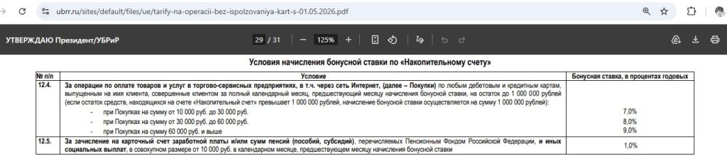С опцией «Доход+» (раньше называлась «Больше плюсов») за 299 руб./мес. (не путать с подпиской MyLife+, это другая) ставка для остатка до 1 млн руб. будет зависеть от оборота по дебетовым и кредитным картам в прошлом месяце (при тратах от 10 000 руб./мес. будет +7% к базовой ставке, при тратах от 30 000 до 60 000 руб./мес. — +8% к базовой ставке, при тратах от 60 000 руб./мес. — +9% к ставке).