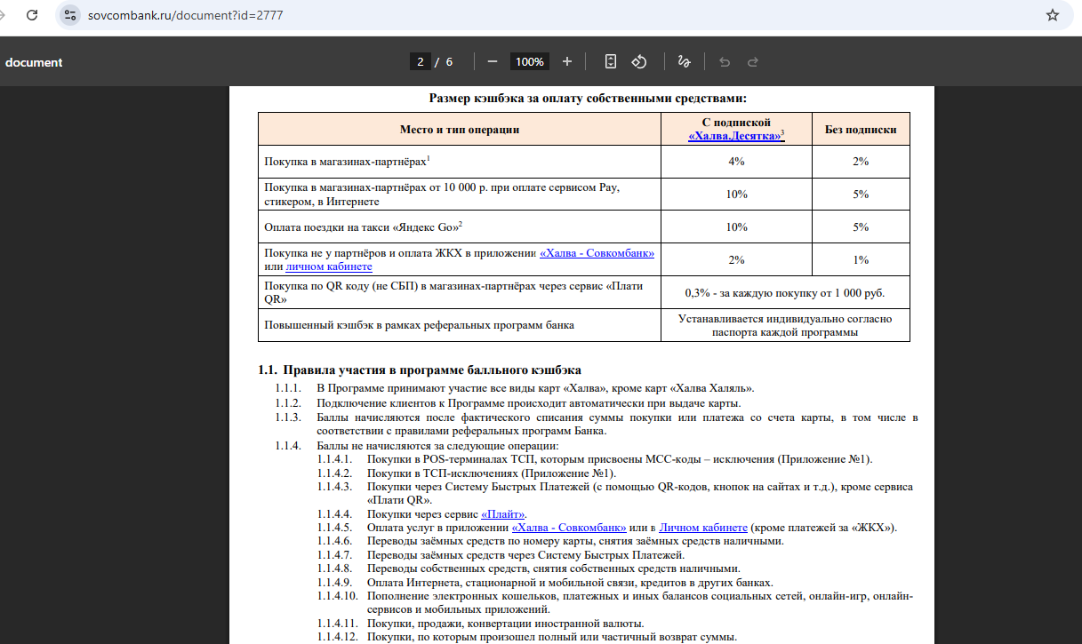 2. Без подписки «Халва.Десятка» при покупках у партнёров собственными средствами с использованием Pay-технологий, платёжного стикера или при покупках в сети интернет кэшбэк без подпиской будет составлять: