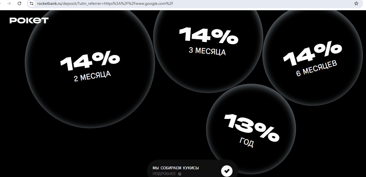На вкладах и накопительных счетах «Рокетбанка» иногда предлагаются неплохие ставки, так, к примеру, на 2-3-6 мес. сейчас предлагают 14% годовых при ключевой ставке в 15% годовых.