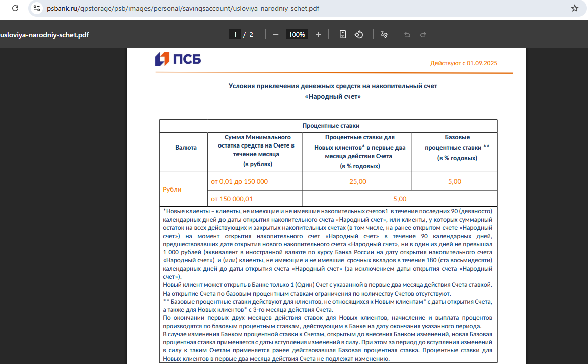 У «ПСБ» появился новый накопительный «Народный счёт», где новичкам в первые 2 расчётных периода на минимальный остаток до 150 000 руб. положено 25% годовых.