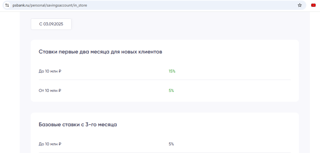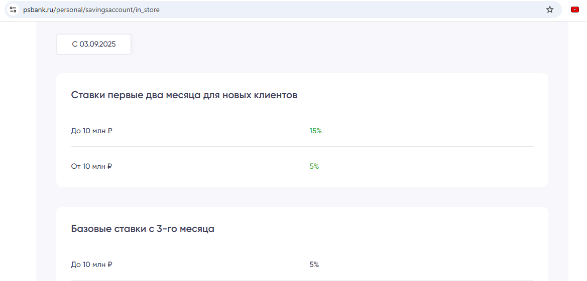 «Народный вклад» от «ПСБ» под 30% годовых можно было открыть только до 21.09.25, но вместо него с 22.09.25 появился другой вклад — «Богатырская ставка» под 33% годовых на срок 91 и 181 день для суммы в 50 000 руб. Выплата процентов ежемесячно.