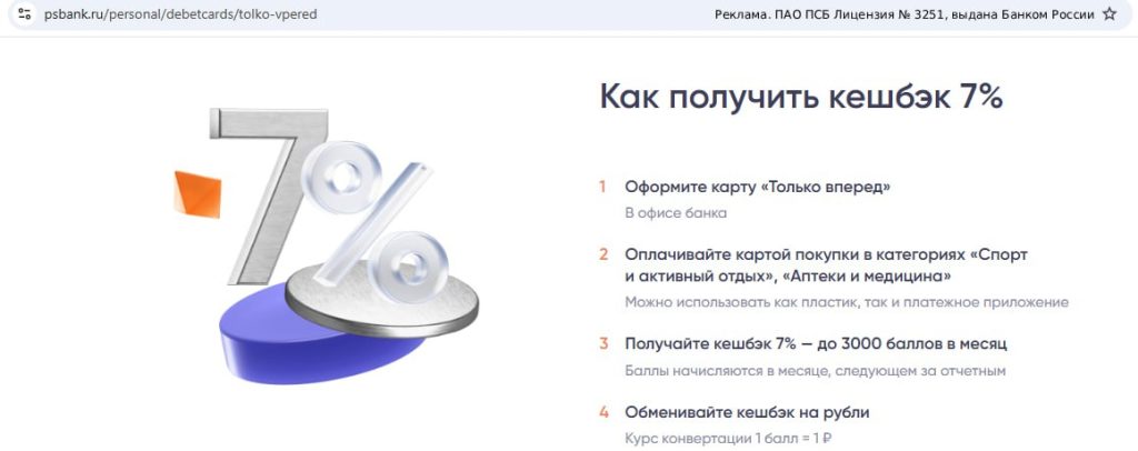 По бесплатной дебетовой карте «Только вперед» от «ПСБ» обещают кэшбэк 7% баллами за покупки в категориях (за остальные траты вознаграждение не положено):