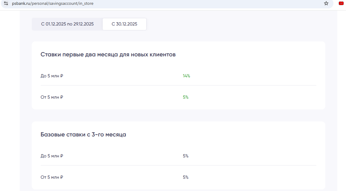 По накопительному счёту «Про запас» в первые два месяца (процентных периода) с 30.12.25 предлагается 14% годовых на минимальный остаток до 5 млн руб. (ставка зафиксирована на это время).
