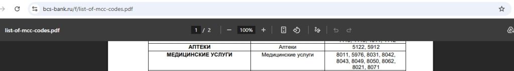 – Аптеки и медицина: МСС 5912, 8011, 8099, 5976, 8031, 8042, 8043, 8049, 8050, 8062, 8071;