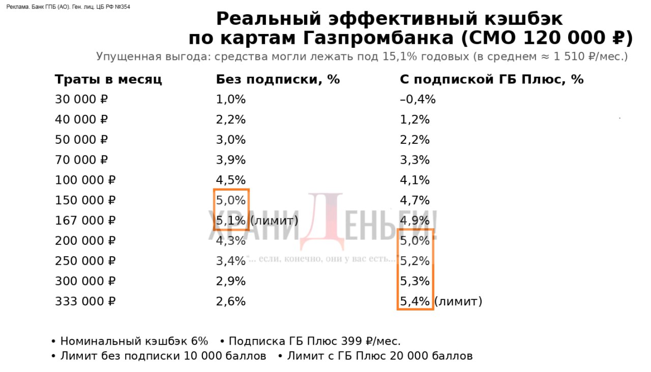 Если хранить на карте от 120 000 руб., то можно рассчитывать на эффективный кэшбэк 3-5,4% при тратах в повышенных категориях от 50 000 до 666 000 руб. с лимитом 10 000-40 000 баллов. Чем больше траты в повышенной категории, тем больше выгода. Расчёты в этом посте.