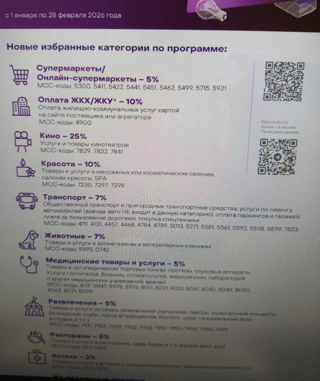 – Супермаркеты — 2% (МСС 5411, 5422, 5441, 5451, 5462, 5499, 5921, 5310, 5311, 5331, 9751, 3990, 3991);