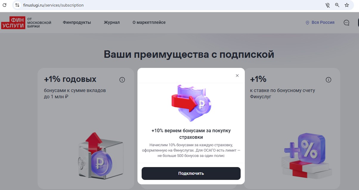 С подпиской «Финуслуги+» (стоит 399 руб./мес.) обещают кэшбэк 10% за оплату ОСАГО через Финуслуги (максимум 500 руб. за полис).