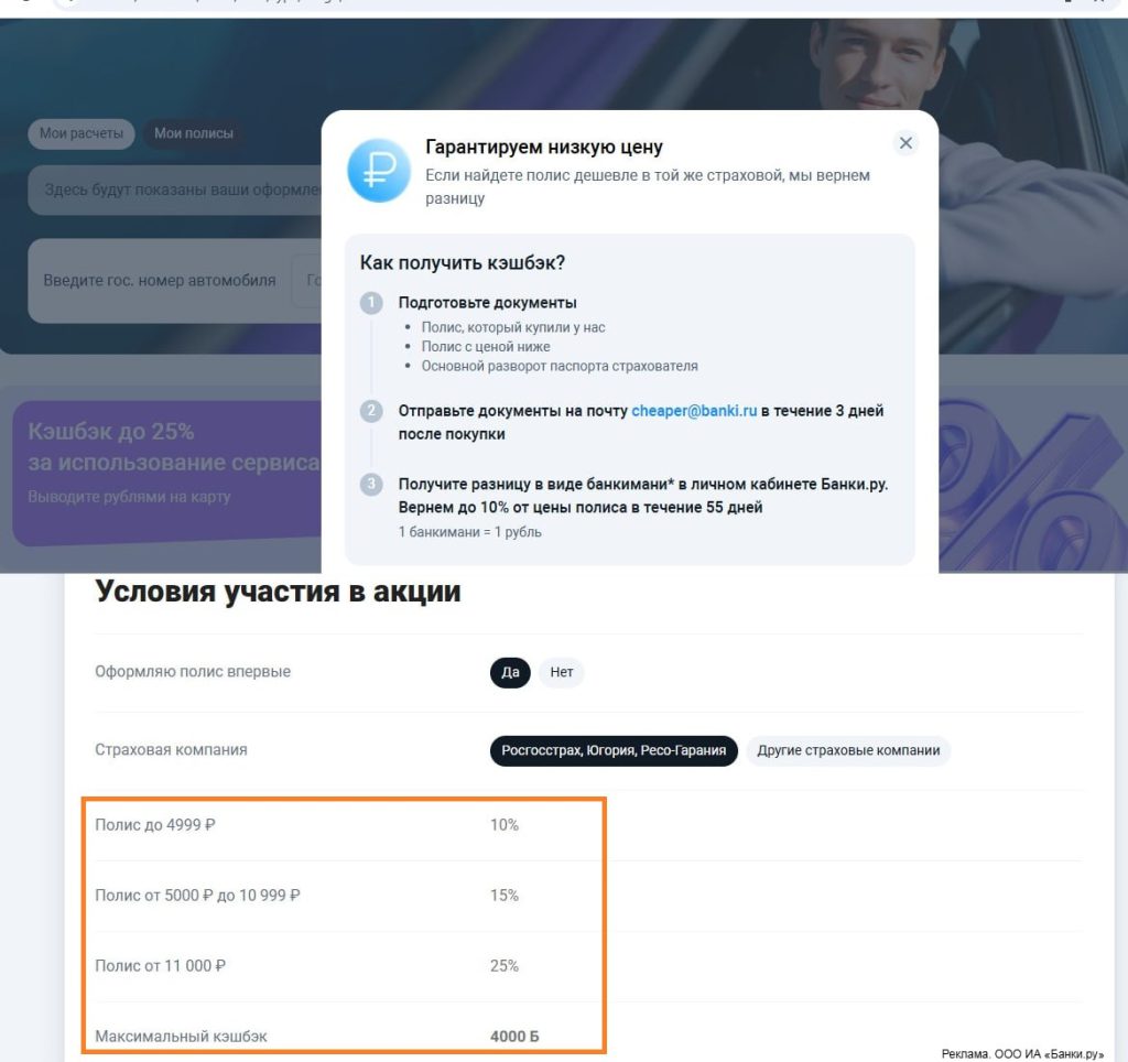 1 Кэшбэк до 25% за ОСАГО на «Банки.ру».