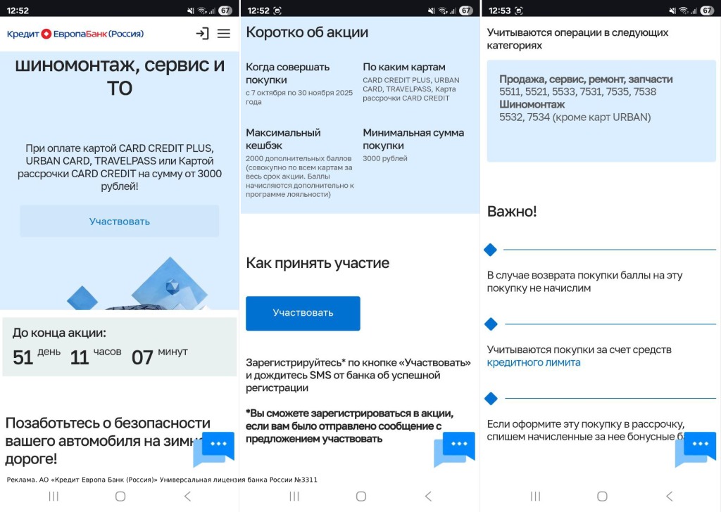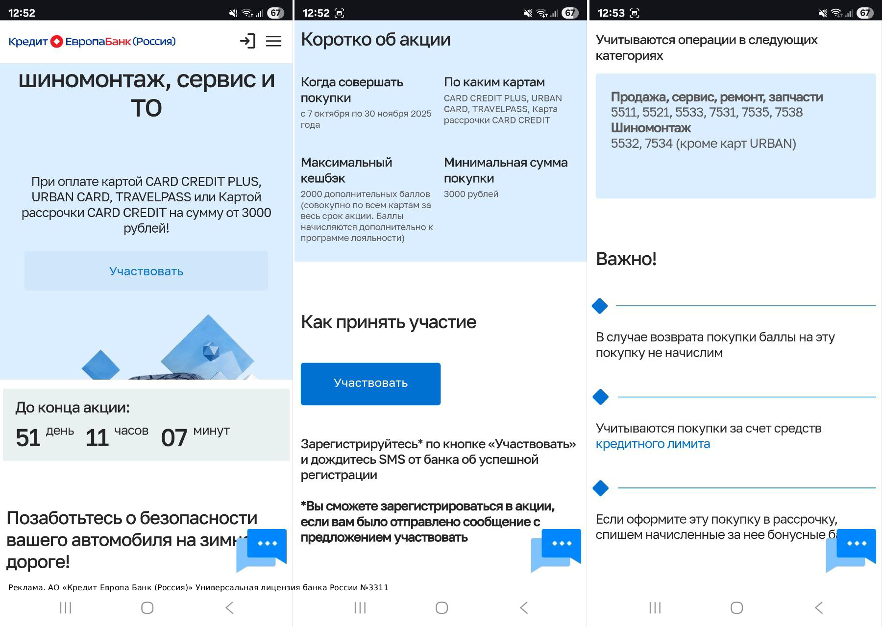 До 30.11.25 по кредитным картам «Кредит Европа Банка» (Urban Card, Card Credit Plus, Card Credit (карта рассрочки), Travelpass) можно получать кэшбэк 5% (1-1,5% базовых + 3,5-4% дополнительных) за автоуслуги, шиномонтаж и запчасти (МСС 5511, 5521, 5533, 7531, 7535, 7538, 5532, 7534) при сумме покупки от 3000 руб.