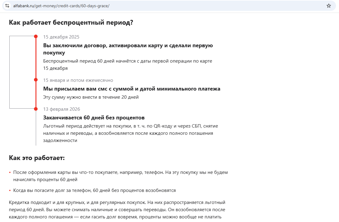 Льготный период не действует на любые покупки по СБП с помощью QR (а также на снятие наличных и переводы). А в тарифах с 13.12.25 к негрейсовым операциям добавляется ещё: оплата штрафов, налоговые платежи, коммунальные платежи, платежи на Госуслугах.
