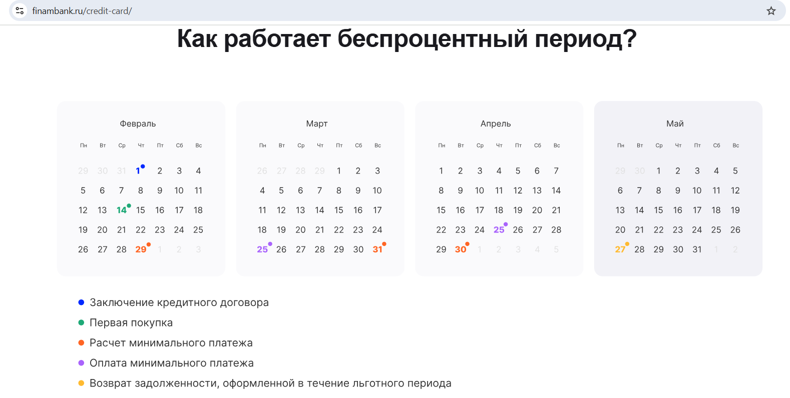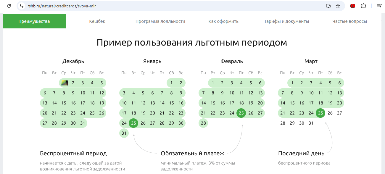 Льготный период у «Своей кредитки» начинается с даты, следующей за датой возникновения льготной задолженности, и заканчивается 25 числа третьего календарного месяца, следующего за месяцем, в котором возникла льготная задолженность. Внутри длинного грейса до 25-го числа каждого месяца нужно вносить минимальные платежи (3% от суммы задолженности). К окончанию грейса нужно погасить всю задолженность, образовавшуюся с даты его начала, т.е. на картинке до 25 марта.
