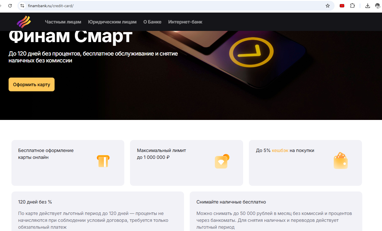 Бесплатную кредитку «Финам Смарт» от банка «Финам» можно отнести сразу к трём категориям, здесь есть и бесплатная обналичка в грейс (до 50 000 руб./мес.), и длинный льготный период до 120 дней, и кэшбэк в 1% на всё и 5% в трёх категориях. Расположим её именно в этом разделе, т.к. обналичка сейчас самый редкий функционал у кредиток.
