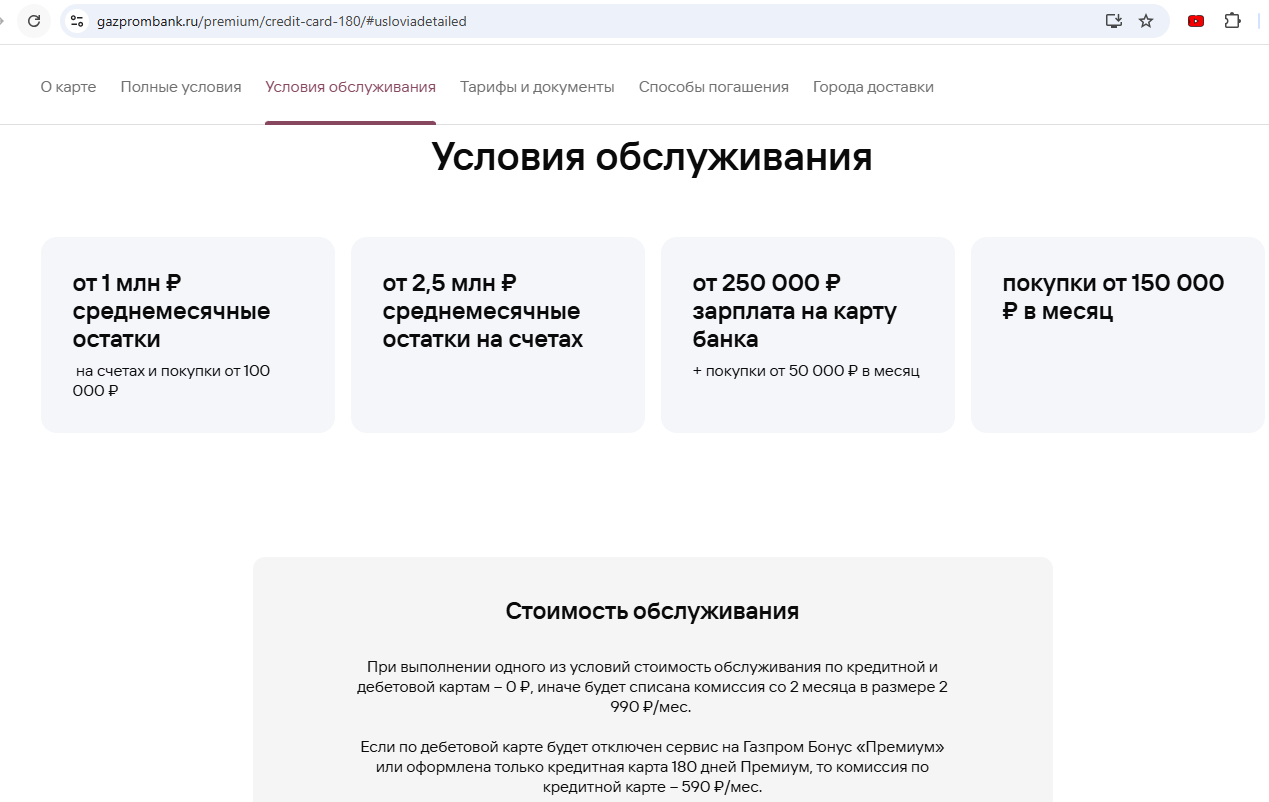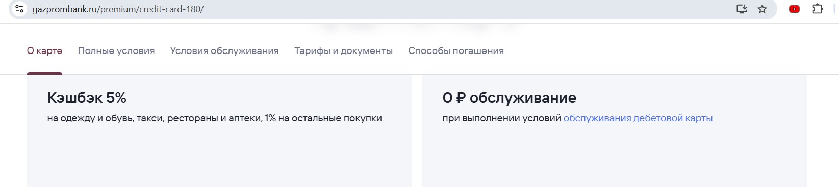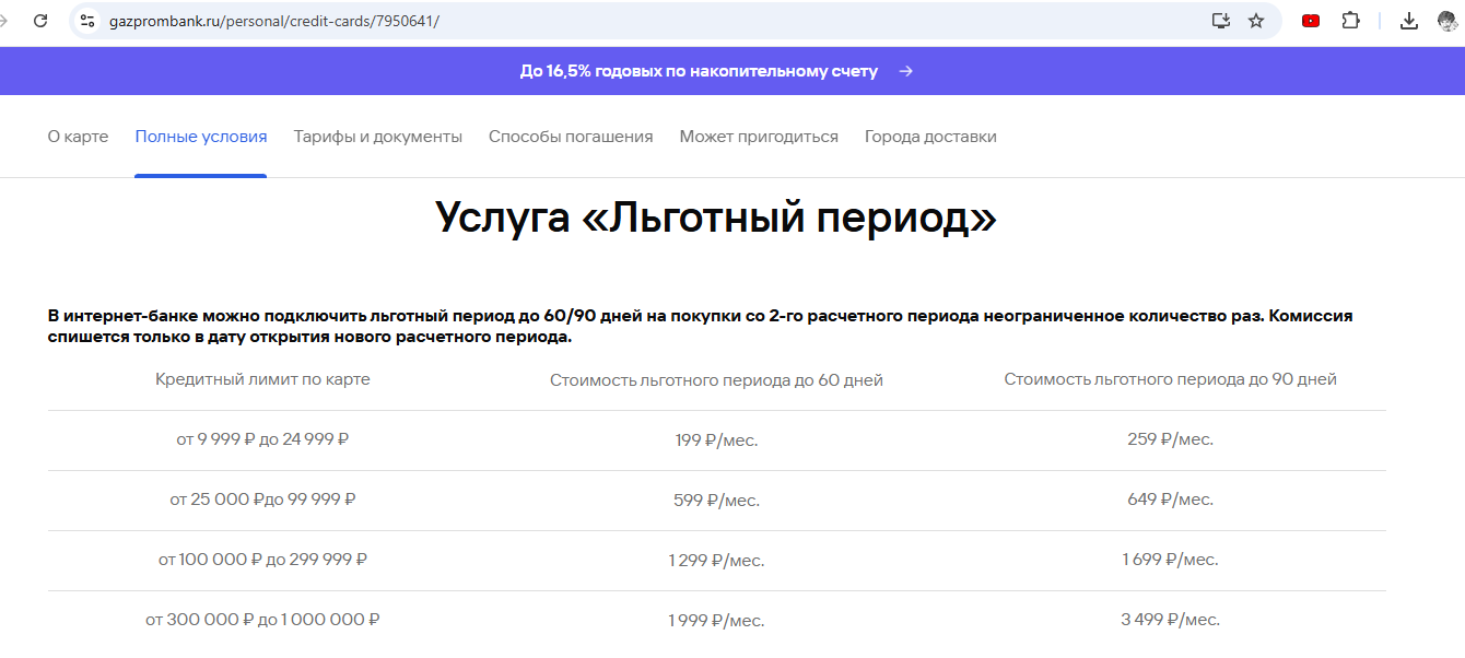 Обычные кредитки «Газпромбанка» стали не очень интересны, грейс до 120 дней действует только в первый расчётный период, далее только 60-90 дней, а кэшбэка нет. Обслуживание бесплатно только в первый год, далее 990 руб./мес. При этом за сам факт грейса 60-90 дней «Газик» хочет немалых денег (до 3 499 руб./мес. в зависимости от кредитного лимита по карте).