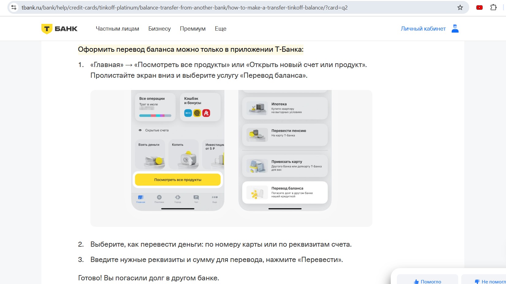 При этом с помощью услуги «Перевод баланса» можно гасить не только кредитки других банков, но и кредиты наличными, и автокредиты. Максимальный перевод по реквизитам счёта составляет 300 000 руб., по реквизитам карты — 150 000 руб.