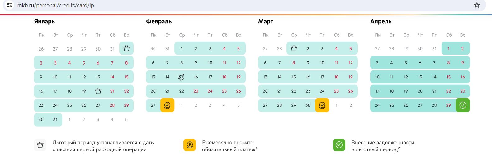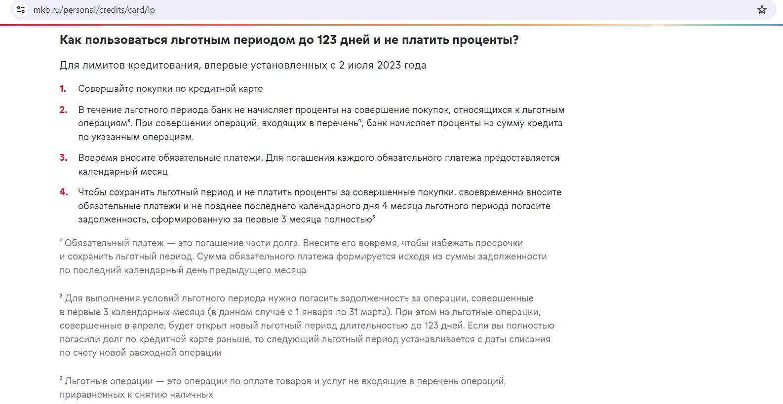 У кредитки «МКБ» грейс-период длится до 123 дней, он начинается с даты отображения по счёту первой расходной операции и длится до конца третьего месяца, следующего за месяцем совершения покупки.