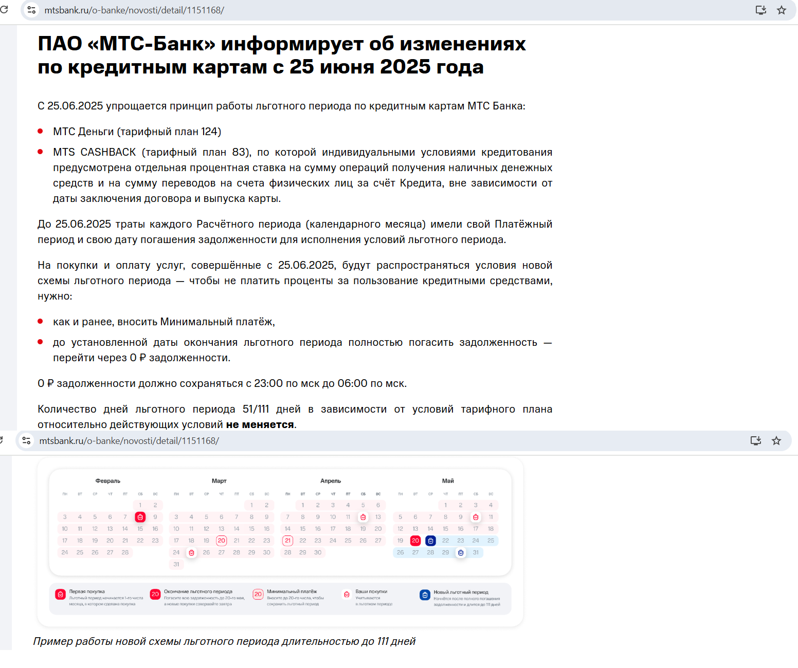 С 25 июня 2025 по кредитным картам «МТС Деньги» и «МТС Cashback» «честная» схема грейса (выгодная клиенту, когда месяц тратим, три месяца погашаем то, что потратили за этот месяц) превратилась в «нечестную» (когда к окончанию льготного периода нужно полностью погасить образовавшуюся за время льготного периода задолженность).