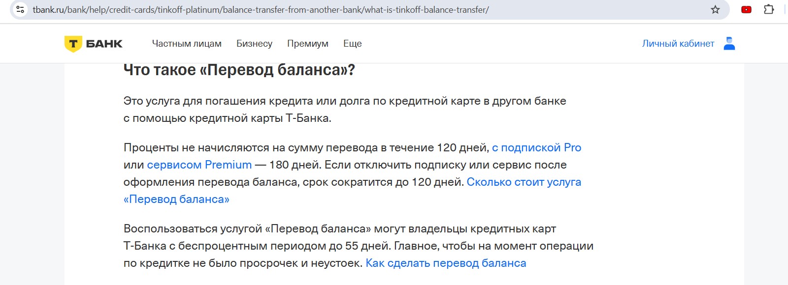 Кроме того, у всех кредиток банка есть услуга «Перевод баланса», в рамках которой раз в год можно бесплатно погасить задолженность по кредитке в другом банке (карту другого банка нужно закрыть) и не платить проценты до 120 дней (либо до 180 дней при наличии подписки Pro и выше). Сумма закрытых кредитных обязательств должна быть не меньше суммы перевода баланса.