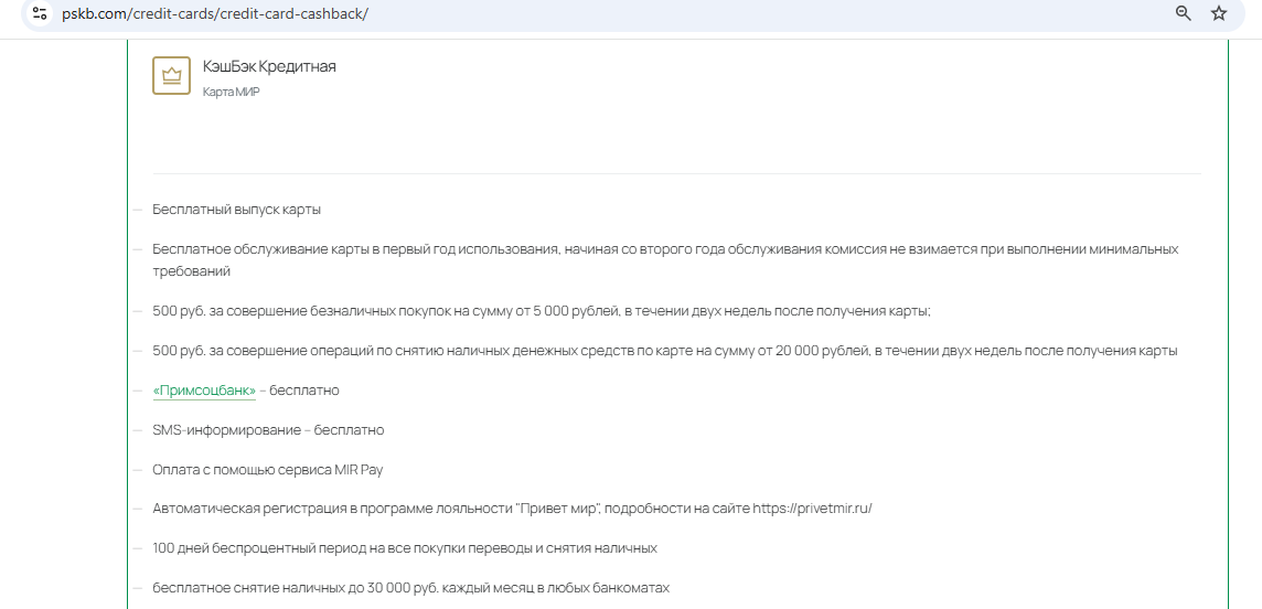 Карта «180 дней без %» от «ПСБ» — довольно выгодная кредитка от крупного банка с длинным грейсом и кэшбэком, но одобряемость у карты невысокая, много отзывов об отказах.