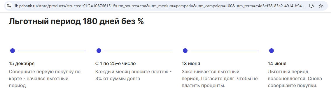 У кредитки «180 день без %» от «ПСБ» возобновляемый льготный период до 180 дней, соблюдая условия которого можно пользоваться деньгами банка и не платить проценты. Длинный льготный период начинается с первой покупки после получения карты (или полного погашения прошлой задолженности) и длится до 180 дней, внутри длинного грейса нужно ежемесячно вносить минимальные платежи (3%).
