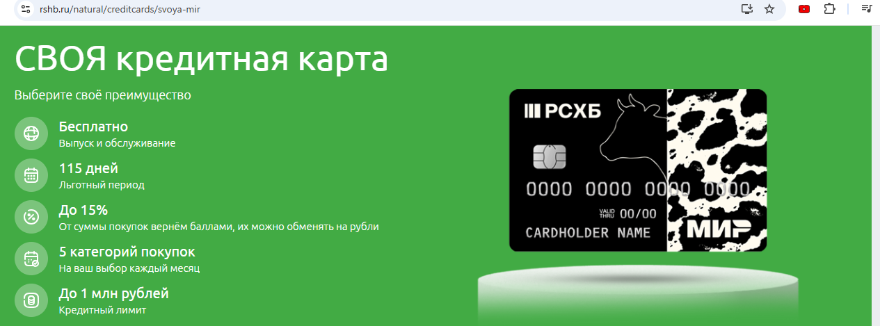 Выпуск и обслуживание кредитной «Своей карты» от «Россельхозбанка» бесплатны без условий. Грейс-период длится до 115 дней. Платёжная система у карты может быть как МИР, так и UnionPay.