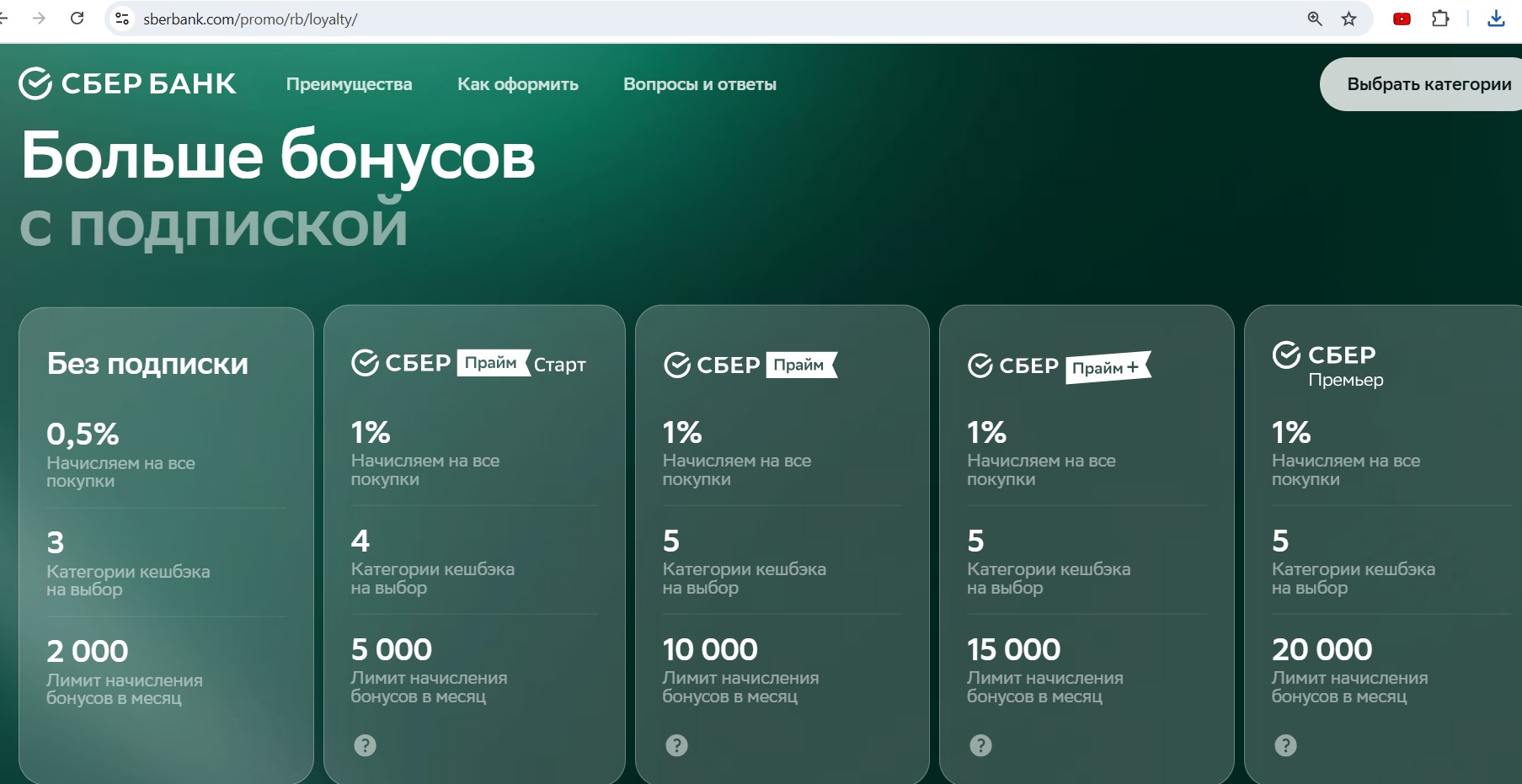 – Подписка «Сберпрайм» — 5 категорий, лимит 10 000 бонусов/мес.;