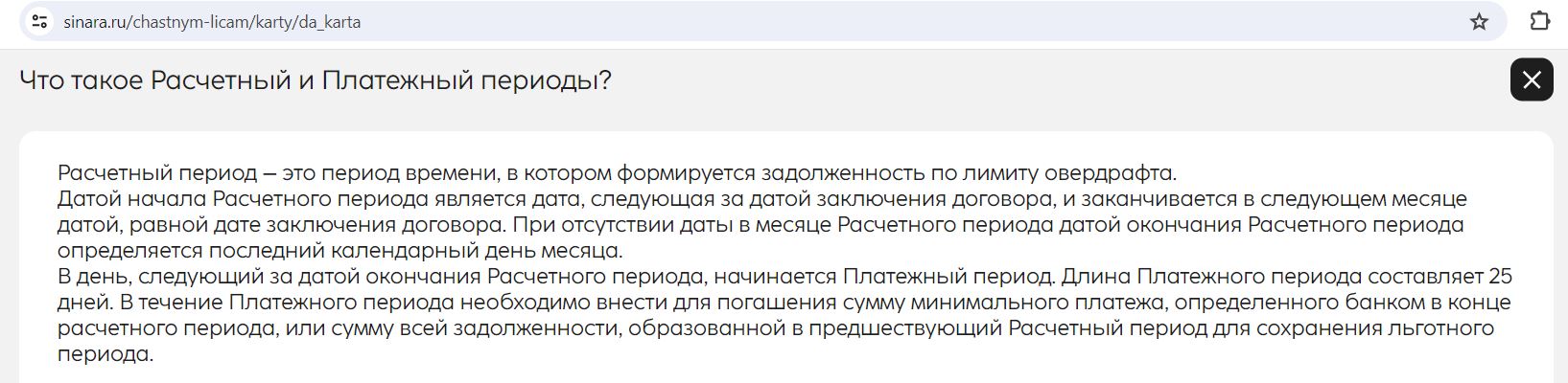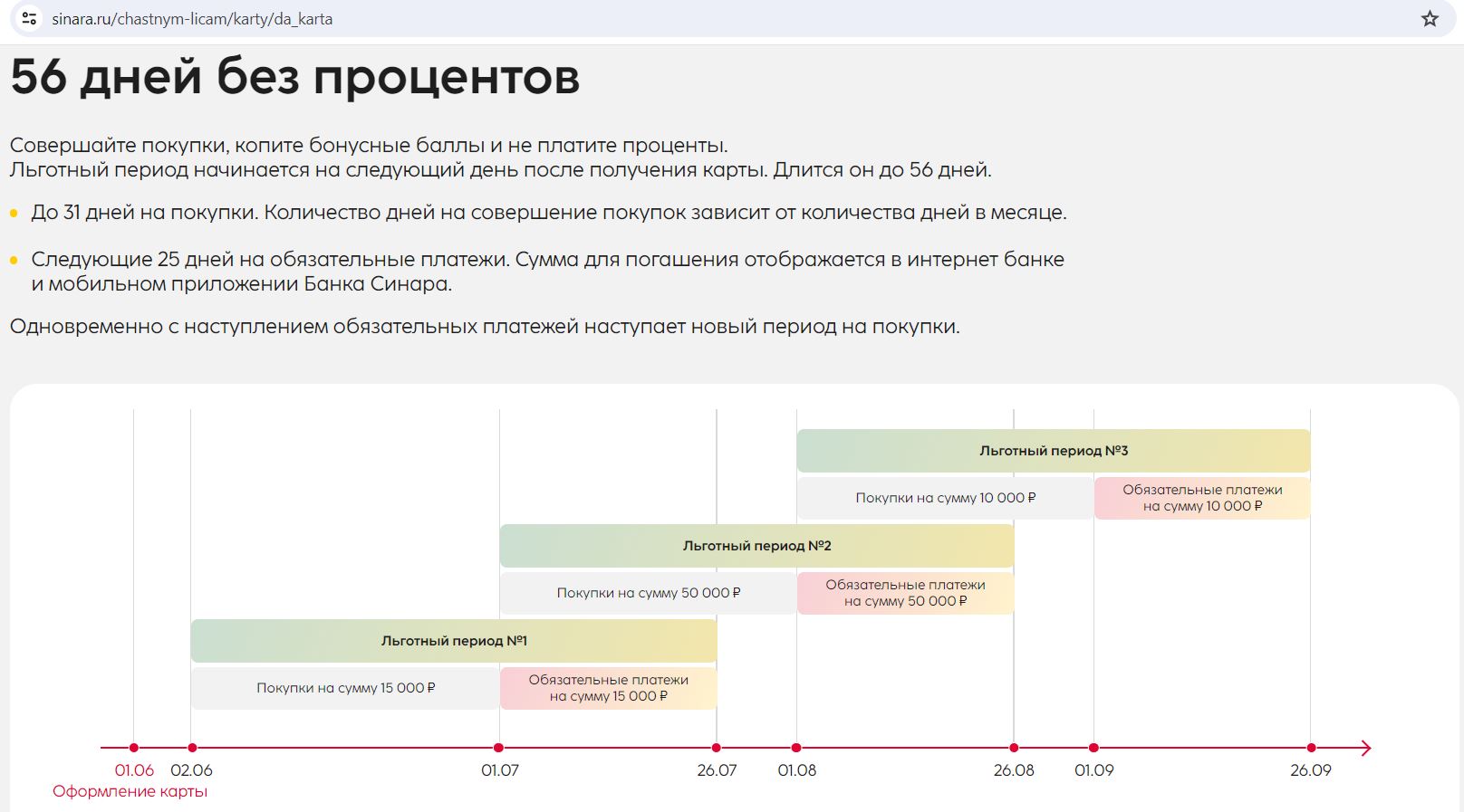 У кредитки «Да!» так называемый «честный» грейс-период до 56 дней. Льготный период начинается со следующего дня после заключения договора. Датой окончания расчётного периода является аналогичная дата следующего месяца минус 1 день. Далее даётся 25 дней платёжного периода, за который нужно погасить задолженность за этот расчётный период. При этом новые покупки попадут уже в новый льготный период.