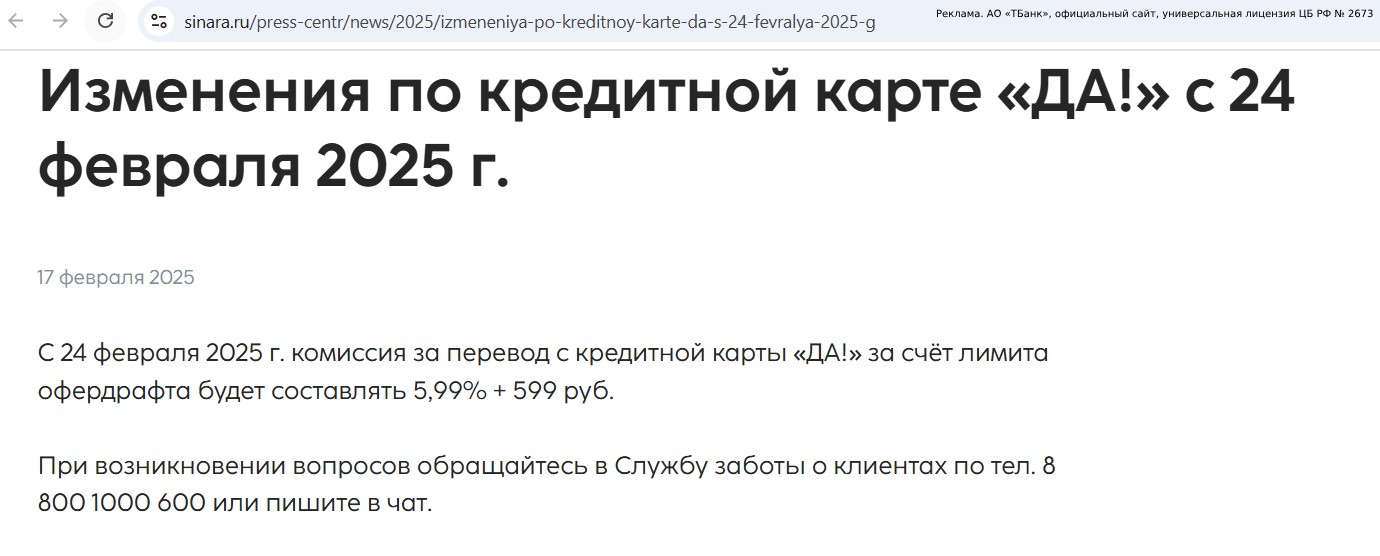 Так с 24.02.25 переводы заёмных средств с кредиток «Да!» банка «Синара», согласно новости, должны облагаться комиссией 5,99%+599 руб.