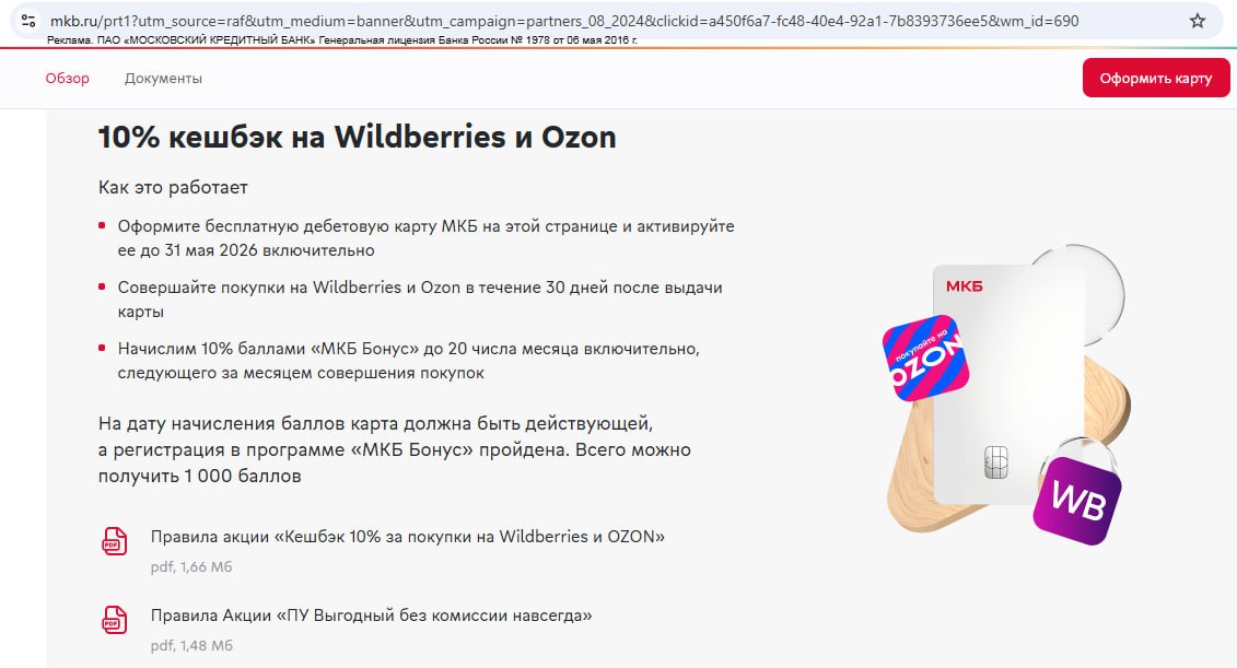 Если заказать дебетовую карту «МКБ» по этой ссылке и активировать её до 31.05.26, то в первые 30 дней по ней будет положен дополнительный кэшбэк 10% в Wildberries и Ozon (в том числе и за покупку подарочных сертификатов), максимум 1000 баллов, а обслуживание карты при этом всегда будет бесплатным без условий.