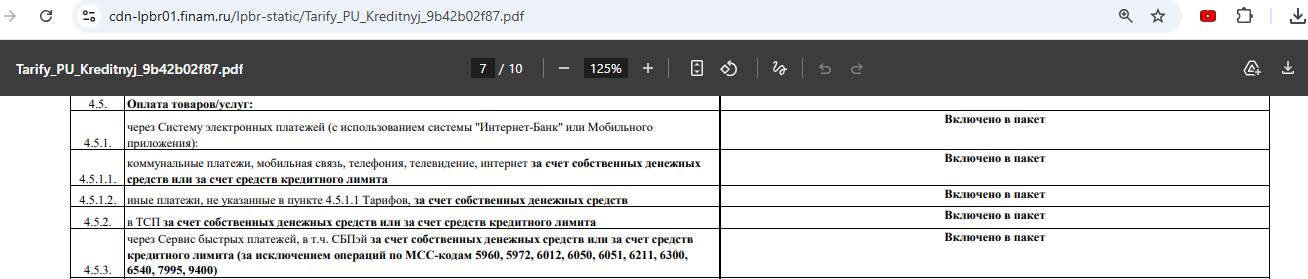 В полных тарифах по пакету услуг «Кредитный» в пункте 4.5.3 есть список МСС-кодов, операции в которых через СБП не включены в стоимость пакета услуг при использовании кредитных средств: 5960, 5972, 6012, 6050, 6051, 6211, 6300, 6540, 7995, 9400.