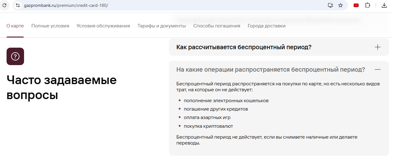 «Газпромбанк» немногословен, в качестве негрейсовых операций кроме снятия наличных и переводов перечислены общие операции без конкретных МСС-кодов.