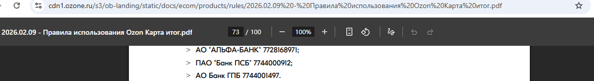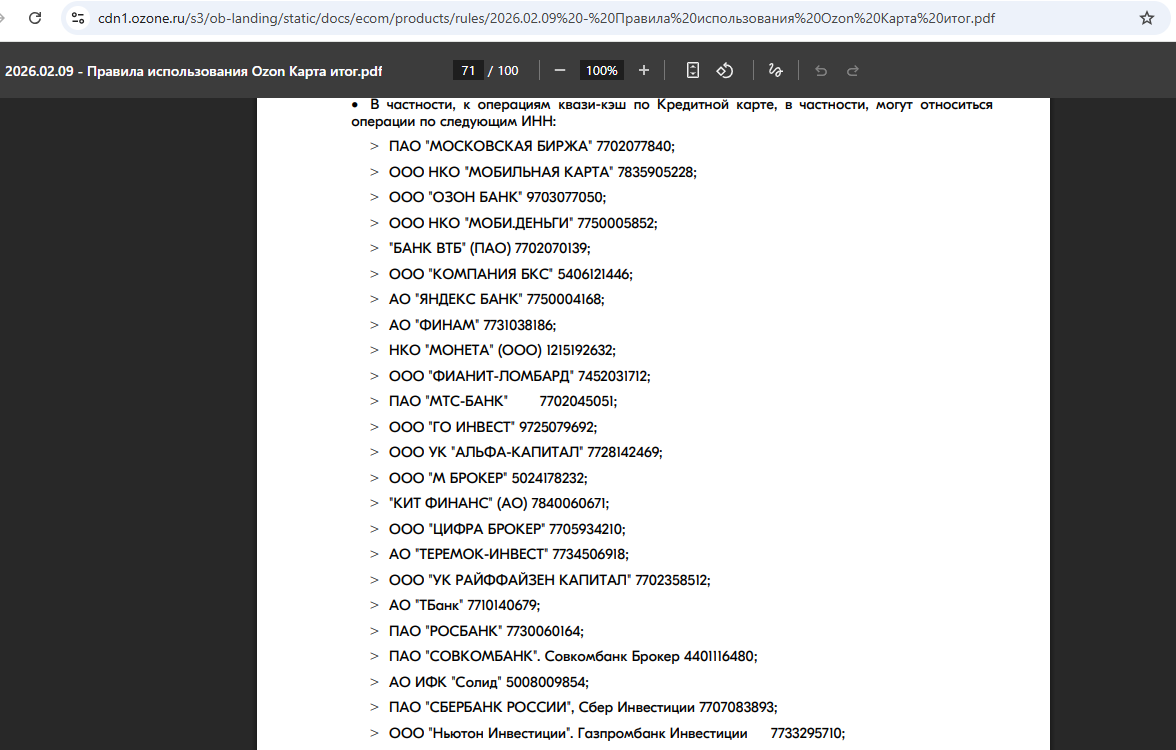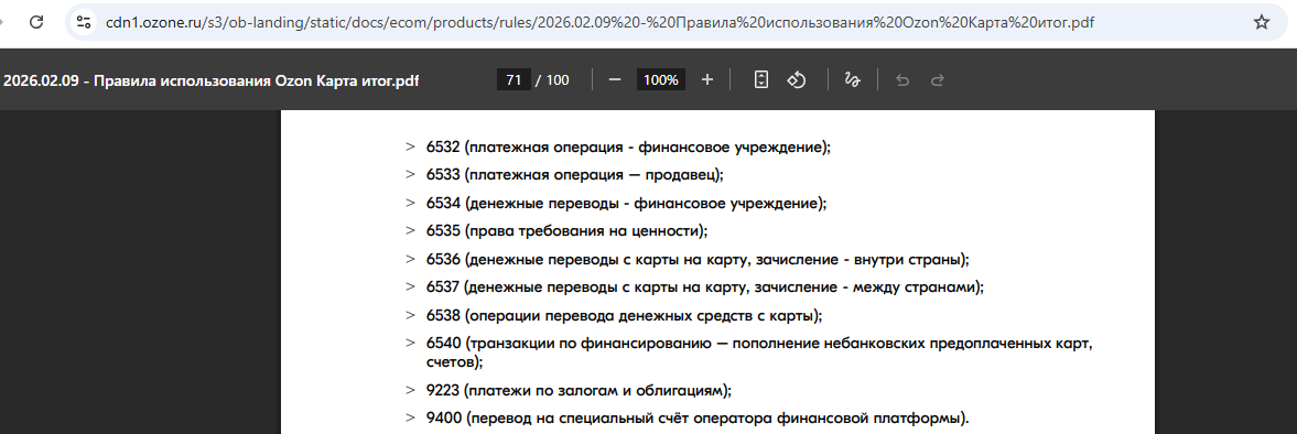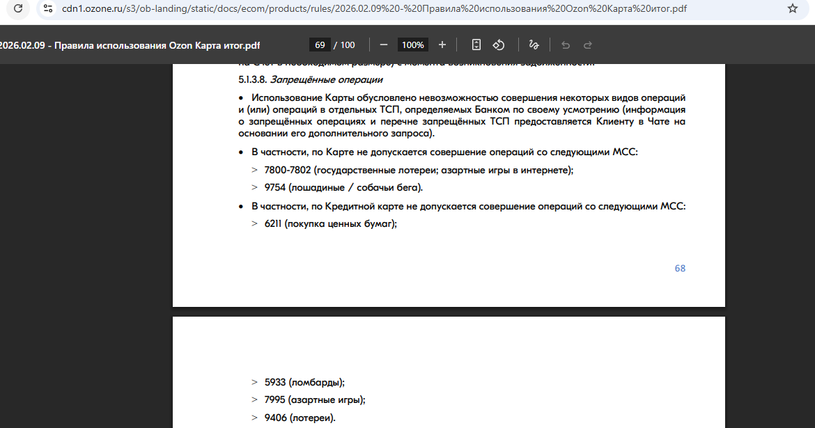 В пункте 5.1.3.8 есть ещё просто запрещённые операции, которые не получится совершить по кредитке «Озон Банка»: